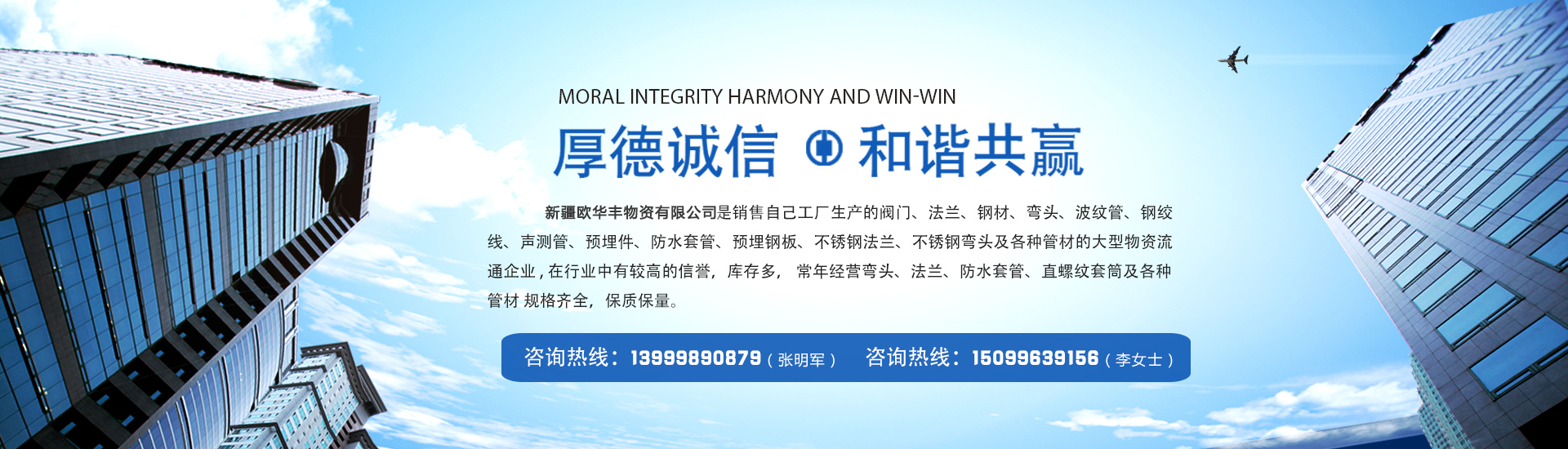 新疆歐華豐物資有限公司是銷售自己工廠生產(chǎn)的彎頭  法蘭  防水套管  及各種管材的大型物資流通企業(yè) , 在行業(yè)中有較高的信譽(yù),庫存多,常年經(jīng)營閥門、法蘭、鋼材、彎頭、波紋管、鋼絞線、聲測管、預(yù)埋件、防水套管、預(yù)埋鋼板、不銹鋼法蘭、不銹鋼彎頭及各種管材 規(guī)格齊全,保質(zhì)保量。 公司一貫以: 服務(wù)上乘、質(zhì)量優(yōu)質(zhì)、價(jià)格合理、客戶至上、服務(wù)周到、讓利客戶、薄利多銷為原則,誠實(shí)守...